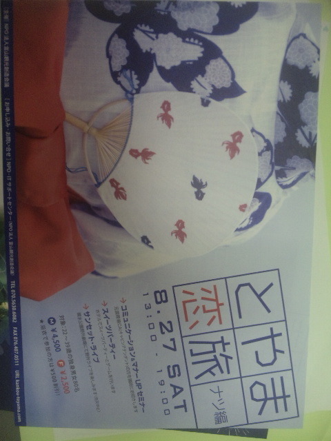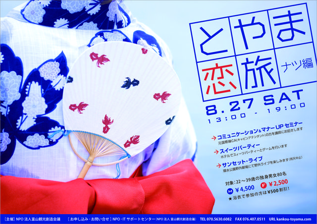 今年度初の ちょい出会い系イベントやります。 かなりいい雰囲気のイベントになるかと思います。 とやま恋旅 〜ナツ編〜 <参加費用> 男性 4500円 女性 2500円 22〜39歳の独身男女 80名 ※男女共に、浴衣で参加の方は500円割引 【コミュニケーション&マナーUPセミナー】 元国際線CA(キャビンアテンダント)の方を講師にお招きします。 男性:恋愛コミュニケーションUP講座 女性:夏の浴衣着こなし術と、マナーUP講座 【スイーツパーティー】 ホテルでスィーツパーティーとゲームを行います。 【サンセット・ライブ】