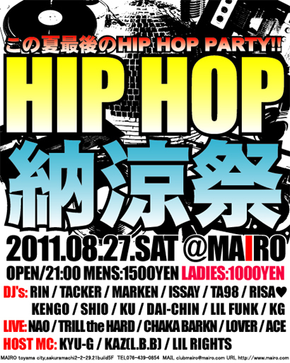 2011/08/27(土) @MAIRO HIPHOP納涼祭 OPEN/21:00 MENS DOOR:¥1500(ND) LADIES DOOR:\1000(ND) DJ: RIN / TACKER / MARKEN / ISSAY / TA98 / RISA / KENGO / SHIO / KU / DAI-CHIN / LIL FUNK / KG LIVE: NAO / IIIG / CHAKA BARKN / LOVER / ACE HOST MC: KYU-G / KAZ(L.B.B) / LIL RIGHTS