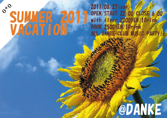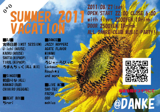良い出会い、繋がりのお陰で 今年の夏も開催することが出来ます。 『o+o -SUMMER VACATION 2011-』 2011/08/27(sat)@DANKE TAKAOKA OPEN/START 22:00 CLOSE 6:00 with flyer 2000YEN/1Drink DOOR 2500YEN/1Drink ALL GANRE CLUB MUSIC PARTY!!! ■DJ■ 宵待日廻[ROCKMAN×mezem.& free player](INST SESSION) U-ICHI(HOUSE) KAORU(HOUSE) SHOTA(HIPHOP) TIROL(HIPHOP) ろまんちっく(ALL MIX) ■BEAT BOX■ ちrori ■LIVE MC■ FRESH ODD mebius SHO-TEC ■SINGER■ 和田りな(ALL) NANAKO