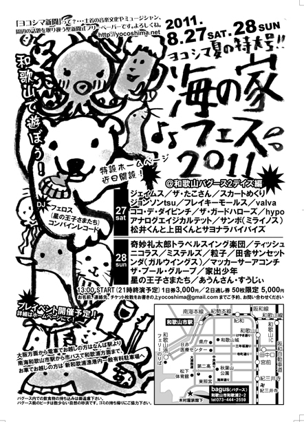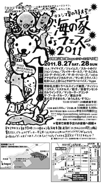 ヨコシマの夏のイベント!! こりゃあ二日ともいかねば。 和歌山からも出ます〜 以下ツイッターより拝借 イベントのことがどんどんどんどん決まって参りました!先ずはタイトルから! 『ヨコシマ夏の特大号!海の家フェス2011@和歌山バグース2デイズ編』!!! そして、出演バンドもどんどん決定!! 出演バンド:松井くんと上田くんとサヨナラバイバイズ、ザ・たこさん、 奇妙礼太郎トラべルスイング楽団、ミステルズ、ココ・デ・ダイピンチ、ティッシュ、 あうんさん・すうじぃ、valva、ジョンソンtsu、スカートめくり、粒子、 ザ・ガ