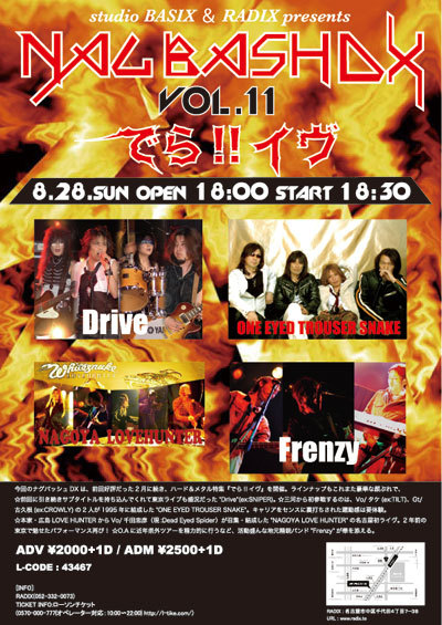 8月28日(日)名古屋 ☆NAG BASH DX Vol.11 『でら!イヴ』 ☆会場/鶴舞RADIX ☆Open/18:00 Start/18:30 ☆Adv\2000+1D Adm\2500+1D 【出演バンド】 One Eyed Trouser Snake ★Drive(ex:SNIPER) ★NAGOYA Love Hunter ★O.A/Frenzy ※ローソンチケット(L-CODE:43467) ※問い合わせ 【studio BASIX】 Tel.Fax/0525056955 http://u-go.to/basix/ 【RADIX】 Tel/0523320073 http://www.radix.to よろしくお願いします。