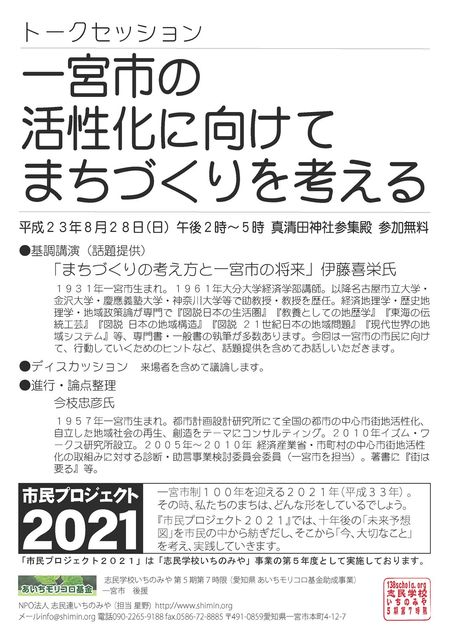 地理学の権威、伊藤喜栄氏から「まちづくりの考え方と一宮市の将来」と題して、一宮市の市民に向けて行動していくためのヒントなど、話題提供を含めてお話しいただき、参加者でフランクにディスカッションします。 進行と論点整理は都市計画の今枝忠彦氏。 伊藤氏、今枝氏ともに一宮出身で一宮を大切にしつつ、全国規模の研究と実践をされてきた方々です。 一宮市でまちづくりを考えるすべての人に参加していただきたいと思い、ご案内差し上げました。 全国の一宮を愛する方、一宮を嫌いな方、お誘いあわせのうえ、お気軽にご参加ください