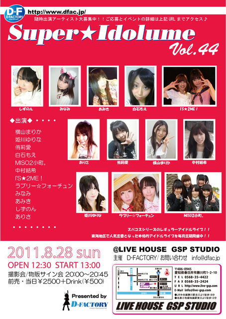 『Super☆Idolume vol.44』 日時:2011.8.28(sun) 会場:GSP STUDIO(春日井市勝川) 出演: ・横山まりか ・姫川ゆりな ・侑莉愛 ・白石もえ ・MISO2小町。 ・中村結希 ・I'S★2ME ! ・ラブリー☆フォーチュン ・みなみ ・あみき ・しずのん ・ありさ ※出演順未定 OPEN:12:30 START:13:00〜 撮影・物販:20:00〜20:45 前売・当日:\2,500+D(\500) ☆チケット予約は各出演者からかこちらまで↓ http://www.dfac.jp/form.html