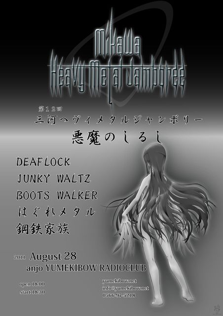 2011年8月28日(日) 第12回 三河ヘヴィメタルジャンボリー “悪魔のしるし” 副題悪魔シリーズ第2弾!! 愛知県安城市夢希望RadioClub http://www.yumekibow.net/ 開場 18:00 開演 18:30 前売り 1500円 当日 2000円 出演 JUNKY WALTZ(岐阜) http://www.junkywaltz.com/jkwz_skl.html http://www.myspace.com/junkywaltz http://mixi.jp/view_community.pl?id=707368 岐阜の重鎮ヘヴィメタルバンド!! ジャンボリー初登場です。 BOOTS WALKER(静岡) http://www.bootswalker.com/ http://www.myspa