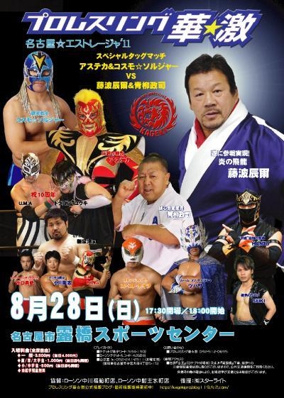 2011年8月28日(日) 『名古屋☆エストレージャ'11』 愛知県名古屋市・露橋スポーツセンター 18時開始/17時30分開場 <全対戦カード> ◆第5試合 60分1本勝負 藤波辰爾&アステカ vs コスモ☆ソルジャー&青柳政司 ※アステカの持つ博多ライトヘビー級王座挑戦を目指すコスモ☆ソルジャーの要望によりカード変更 ◆第4試合 スターライト杯12人参加バトルロイヤル ※第5試合に出場する選手以外が参加 ◆第3試合 【U.M.A&ドラゴン・ユウキ10周年記念試合】 45分1本勝負 U.M.A&ドラゴン・ユウキ vs HANZO