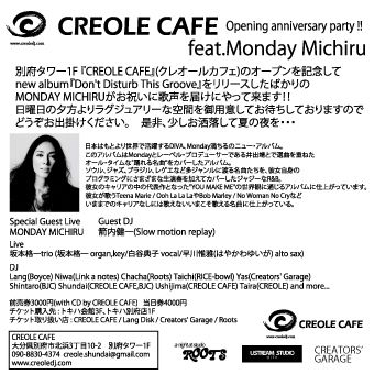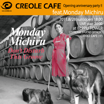 別府タワー1F『CREOLE CAFE』(クレオールカフェ)のオープンを記念してnew album『Don't Disturb This Groove』をリリースしたばかりのMONDAY MICHIRUがお祝いに歌声を届けにやって来ます!! 日曜日の夕方よりラグジュアリーな空間を御用意してお待ちしておりますので、どうぞお出掛けください。是非、少しお洒落して夏の夜を…