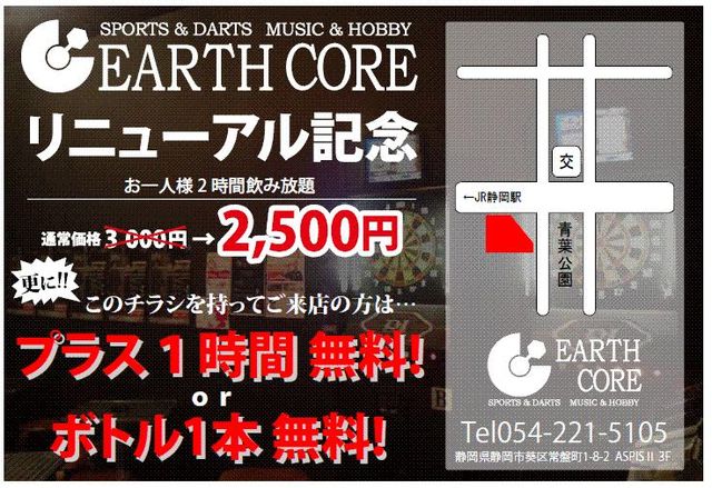 〜・〜・〜告知失礼いたします〜・〜・〜 青葉交番そばのダーツバー。 アースコアがリニューアルしました。 期間中は 飲み放題2時間 2500円(通常3000円) ボトル制/ボトルが1本 2500円(通常3000円) でお待ちしております。 更に来店時に携帯で添付の写真を見せてくれた方には その内容をサービスします! ※写真でサービスは8月中のみのサービスです。