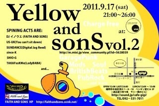 〜Yellow and Sons vol.2〜 http://mixi.jp/view_community.pl?id=5628039 2011.09.17(Sat) 21:00〜26:00 No Charge!! Mods,Garage Punk,British Beat,Soul,Pub Rock,Punk,New Wave,Altarnative,Covers...and more SPINING ACTS ARE: DJイノウエ(FAITH AND SONS) US-UK(You can't sit down) since-K TAKAFxxKMe(LadyBABA) 小泉陽介 SHIO-G SUNDANCE(Digital Jag Reed) 来場者に先着でDJ編集のCD-Rをプレゼント!! @gigi 092-531-7011 福岡市中央区清川1−8−10ペンギン堂ビル3F (渡