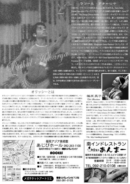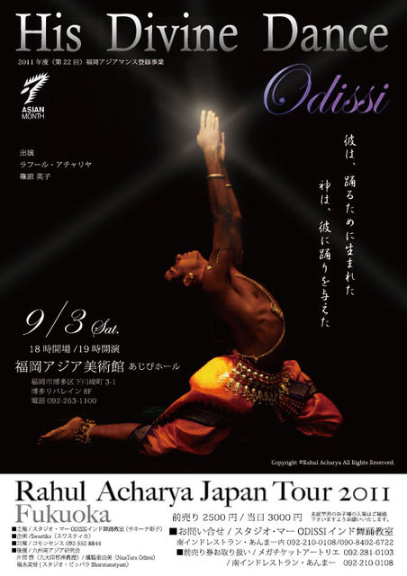 滅多にないOdissi舞踊家の福岡公演です。 インドオリッサ州から、現在国内外で活躍中のOdissi舞踊家 Rahul Acharya氏が来日します。 本場オリッサの舞踊をぜひご覧くださいませ♪ 詳細は以下のとおりとなります。 :::::::::::::::::::::::::::::::::::: Rahul Acharya Japan tour 2011 in Fukuoka ODISSI 〜His Divine Dance〜 ■2011年9月3日(土) Open>18:00 Start>19:00 ■会場:福岡アジア美術館あじびホール 福岡市博多区下川端町3-1 リバレインセン