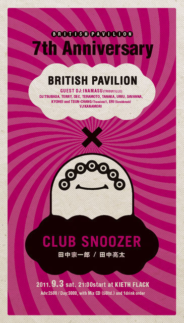 British Pavilion 7th annniversary special- BRITISH PAVILION×CLUB SNOOZER @KIETH FLACK 2011.09.03(sat) OPEN/START 21:00 Adv:2500/1drink order, Day:3000/1drink order ★先着50名様にDJ TSUBASA MIX CDプレゼント ■SPECIAL GUEST DJ:田中宗一郎(CLUB SNOOZER,田中亮太(CLUB SNOOZER) ■2F DJ:TSUBASA,TERRY,OEC,TERAMOTO ■1F DJ:TANAKA,URIU,SAVANNA,KYOHEI and TSUN-CHANG(Transista!),ERI(Scrubbrush) ■GUEST DJ:INAMASU(TROUVILLE) ■VJ: KANAMORI ■TICKET □ローソンチケット L-CODE: 89504