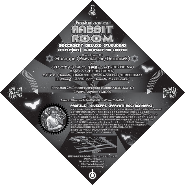 2年ぶりにGiuseppeおじ様来福の巻です。。 [Rabbit Room -Parvati Rec Japan Tour-] 2011.09.17(sat) 23:00〜 FEE 3,000yen @decadent DELUXE (FUKUOKA) *Special Guest DJ ・Giuseppe (Parvati Rec/Denmark) DJ's ・ごはんですよ(relation/厚井会/へんま/HIROSHIMA) ・Kago(へんま/HIROSHIMA) ・⊂НΨ∈(GomeN/COMMINGLE/West Wood Park/HIROSHIMA) ・Bit-Chang(Rabbit Room/GomeN/Pokka Pooka) VJ's ・keit4min(Fullmoon Rec/Spike-Bloom/KUMAMOTO) ・Livera Rhythm(LRDO) Flyer Design ・Askarin