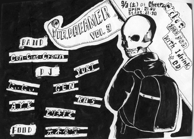 またまたやりますYTR☆DREAMER! 今回はゆとり世代BAND、ConーConsーCrownと、 セブンの店員ダイバーでお馴染みの にぃにぃを招いてのYTRです♪ 更に焼き鳥武者修行で大阪に行った ex.パンチパーマまさと改め元木、 とりきぞくのFOODも有り! ホールスタッフで培った彼の腕を とくとご覧あれ!! そして今回はSelect CDを配ろうと目論んでおりますので 是非とももらって下さいー! そんな感じで今回のYTRも絶対楽しい事請け合い! 皆でワイワイはしゃぎましょー♪ 『YTR☆DREAMER vol.3』 2011.9.3(土)