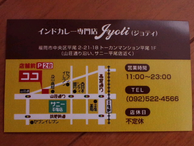 インドカレー専門店『Jyoti』(ジョティ)にカレー食べに来ないか? 7月17日にオープンしたインドカレー屋 インドの三つ星レストランでチーフシェフを務めたシェフが作るカレーは滅茶苦茶美味いんだぜ! オープン記念で只今ランチ¥680〜・ディナー¥820〜 焼き立てナンのお代わり自由 ランチは13種類・ディナーは40種類のカレーから選べ、辛さも甘口から激辛迄おk タンドリーチキンやシシカバブもご用意致しております 紅一点(笑)のおにゃのこに「VIPから来ますた」って言って頂ければ何かしらサービスする予定( ^ω^) ※おにゃのこの出没