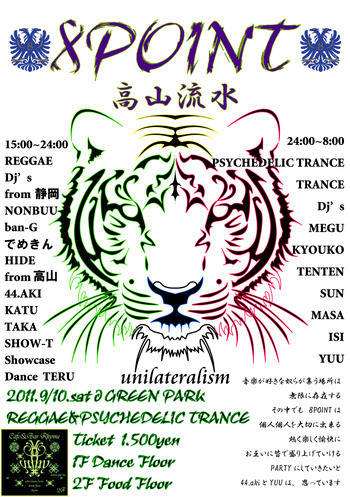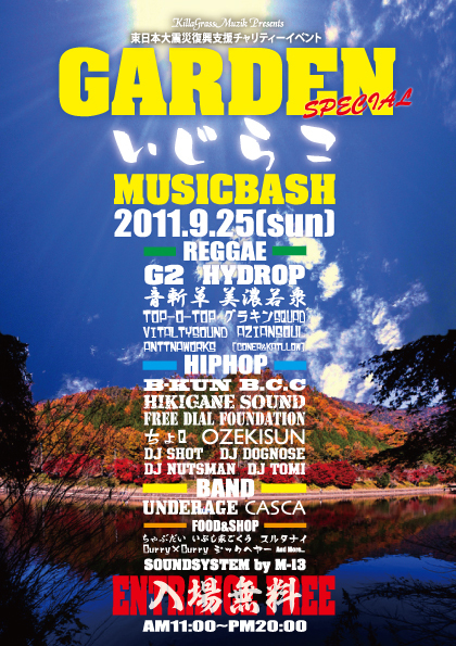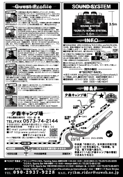 管理人様、同じ東濃の中津川から若者達の若者による音楽の祭りの告知失礼します! 『AOZORA REGGAE 2011』 9/25(SUN)@岐阜県中津川市夕森キャンプ場 ステージ広場 10:30〜17:30 当日3000円 前売り2000円 高校生1000円 中学生以下無料 with FRYER 2500円 [SPECIAL GUEST SOUND] KAZU from BURN DOWN [GUEST DEE JAY]from大阪 STEREON PEQUU HI-BREAD EXPRESS ZOVE KING JIGEN [GUEST DEE JAY] from長野 APPLE EYE SHOW SPRING ASSAULT [GUEST D
