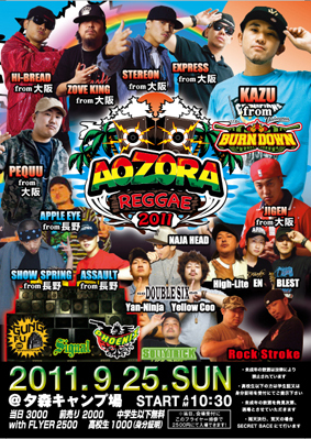 『AOZORA REGGAE 2011』 9/25(SUN)@岐阜県中津川市夕森キャンプ場 ステージ広場 10:30〜17:00 当日3000円 前売り2000円 高校生1000円 中学生以下無料 with FRYER 2500円 [SPECIAL GUEST SOUND] KAZU from BURN DOWN [GUEST DEE JAY]from大阪 STEREON PEQUU HI-BREAD EXPRESS ZOVE KING JIGEN [GUEST DEE JAY] from長野 APPLE EYE SHOW SPRING ASSAULT [GUEST DEE JAY] Double Six NAJA HEAD [SOUND SYSTEM] by 『GUNG FU』 [S