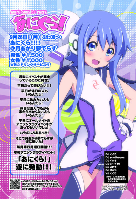 あにくら!!!〜第二月曜もやっちゃうよ〜 @川崎 club 月あかり夢てらす !!!開催日!!! 2011年09月12日 月曜日 !!!開催時間!!! 開演 24:00〜 !!!入場料!!! 男性1,500 女性1,000 ※各2ドリンクサービス付 ※再入場可能(コスプレを着たままの外出はご遠慮ください) !!!イベント内容!!! 週末にイベントが集中しているこのご時世。 平日だって遊びたい!!! 平日が休日の人もいるんだし! 平日に休みたい人もいるんだし! 休日は混んでるから家から出たくない人もいるんだし! 平日に