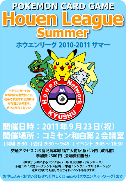 名称:ホウエンリーグ2010-2011 サマー 開場:9:30 受付:9:30〜9:45 イベント:9:45〜16:30 交通アクセス:JR鹿児島本線 福工大前駅 駅ビル内(改札前) 参加費:300円(会場費相当分) 参加方法:参加表明をして下さい。 <レギュレーション> 対戦形式:シングルバトル デッキ枚数:60枚 サイドカード枚数:6枚 制限時間:30分 使用できるカード:ポケモンカードゲームLEGENDシリーズ・BWシリーズのすべてのカード イベントルール:ホウエンリーグ説明書Ver.3.12(http://members3.jcom.home.ne.jp/houen-network/arti