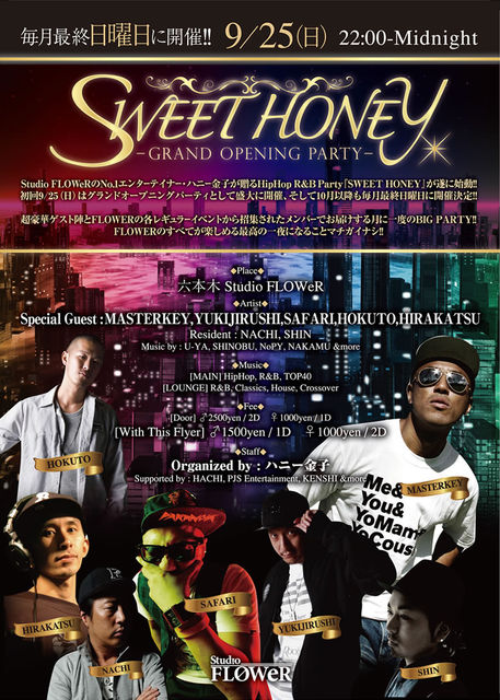 管理人様、告知失礼します。 毎月最終日曜日開催 『SWEET HONEY』 2011.9.25 Sunday 22:00-Midnight ☆超Big Party始動!☆ スタジオ・フラワーの毎月最終日曜日にHotなBig Party「SWEET HONEY」 が いよいよ始まります★ 第1回目の9/25(sun)は“GRAND OPENING PARTY”として、 超豪華なゲスト陣を迎えて盛大に開催いたします。 お見逃しないように! ---------------------------------------------- ★ゲストお取りします★ エントランスにて、 『シノブのゲストでフラワー』 と伝えて頂ければゲスト料金 男性 15