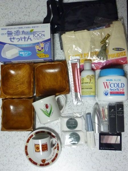 【お知らせ】 コメントに書きましたように無事出産を終えました。 雑貨箱に関しては当選者無しのため、改めてイベントさせていただきます。 コメントいただいた皆様、本当にありがとうございました!!! いつもあげくだ共にお世話になります。 ちょっと久々にイベント立てます。 【あげます】 今回は、雑貨箱を1名の方に差し上げます☆ 写真の移りがいまいちで御免なさい 中身 ◆食器(カップや木製のお皿) ◆化粧品類(KATEのアイシャドウ、ボディショップのマッサージジェル、ラボラボのグロス、アロエの