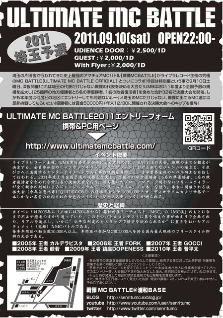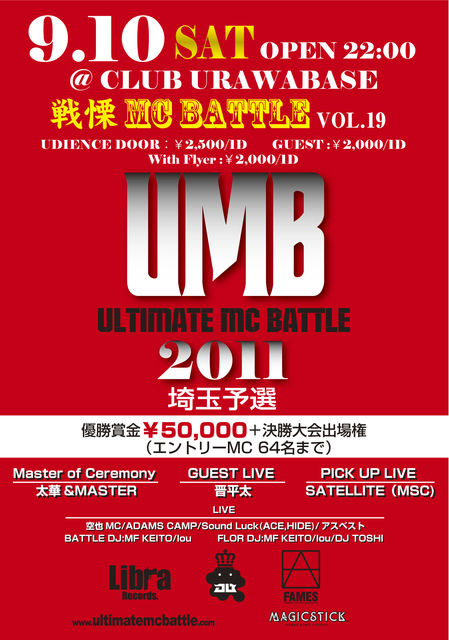 埼玉の片田舎で行われてきた史上最強のアマチュアMCバトル【戦慄MCBATTLE】 がライブラレコード主催の究極のMC BATTLE【ULTIMATE MC BATTLE OFFICIAL】 とついにコラボ! 今回は特別編という事で9月10日土曜日、深夜開催! これは埼玉の代表だけじゃない戦慄の代表を決める大会だ! UMBは2011年度より全国予選の規模を拡大し 【25箇所の地方優勝者と6名の準優勝者、1名の敗者復活者】 を含めた合計32名で決勝大会を開催。 しかも本年度は何度どの地区にエントリーしても問題ないルール! 埼玉のMCだけじゃない、戦慄に出てるMC達には是