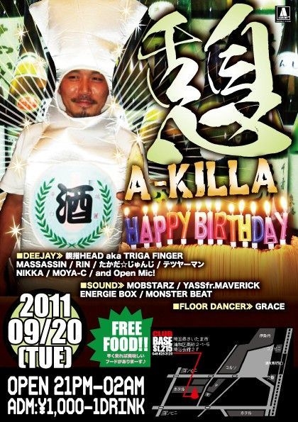 管理人様、告知を失礼致します 先月のスペシャルも大好評で終わり、今月もやって来ました 埼玉老舗ダンスの憩!!!!! 今回はA-KILLA HAPPYBIRTHDAY!!!!!!!! \1,000-1dで更にFREE FOOD!!!! 火曜日のイベントですので、平日しか休みがない方にうってつけ! 次の日仕事がある方でも2時までなので手軽に来れるダンス! もちろんラバダブOPEN MICなので歌い手の方も是非 毎月火曜日はみんな浦和BASEに集合! 9/20(火)憩-IKOI- @浦和Club BASE 埼玉県さいたま市浦和区高砂2-1-5 埼浴会館2F 048-825-3120
