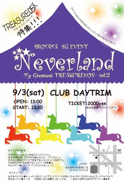 管理人様、貴重なスペースお借り致しますm(_ _)m 皆さんこんにちは(^O^) BIGMAMAのDJイベント『Neverland』の第2弾が開催決定しました その名も・・・ Neverland.vol2〜My Greatest TREASURE05X〜 イベント詳細↓↓ DJ Event 今回は愛知の野外フェス『TREASURE05X(ラグーナビーチ)』を特集したDJイベント コンセプトは『TREASURE参戦者同士が仲良くなってもらうこと』と『TREASUREの予習をしてもらうこと』です。 BIGMAMAファンはもちろんB