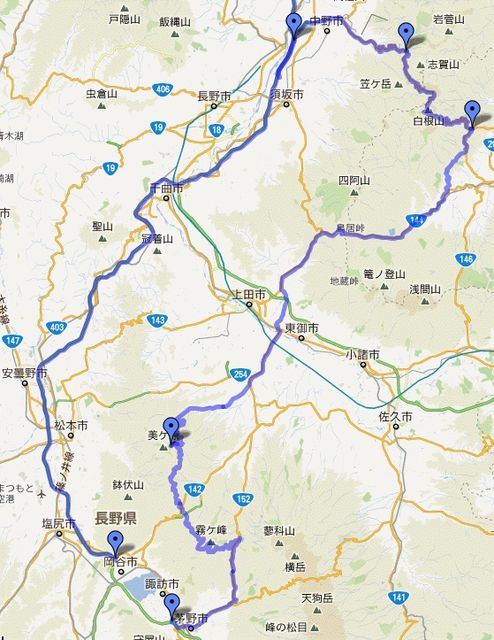 シルバーウィーク後半の企画です。 「その他雑談」トピで皆さんに相談していましたが、 とりあえずイベントとして提案します。 9/23と9/25は移動日となるため、イベントは9/24(土)ということにします。 現在の私の予定・・・というか希望 9/23 広島〜諏訪泊(ほぼ高速) 9/24 8時集合 集合場所:セブンイレブン茅野塚原店(地図参照) コース: 集合場所⇒R152⇒ビーナスライン⇒美ヶ原⇒県道62⇒R152⇒上田(大屋)⇒ R144⇒つまごいパノラマライン北ルート⇒万座・鹿沢口⇒県道59⇒ 草津⇒R292⇒(渋峠)⇒信州中野IC⇒上信越道⇒