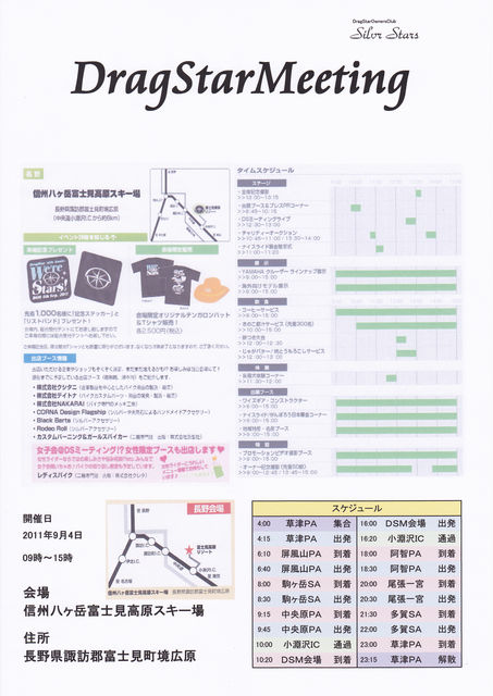 中止になりました。 ドラッグスター乗りなら一度は行きたい鉄板イベントとなった、ドラッグスターミーティングが今年も開催決定!みんなでツーリングがてら参加しようぜ! <スケジュール> 4:00 草津PA 集合 4:15 草津PA 出発 6:10 屏風山PA 到着 6:40 屏風山PA 出発 8:00 駒ヶ岳SA 到着 8:30 駒ヶ岳SA 出発 9:15 中央原PA 到着 9:45 中央原PA 出発 10:00 小淵沢IC 通過 10:20 DSM会場 到着