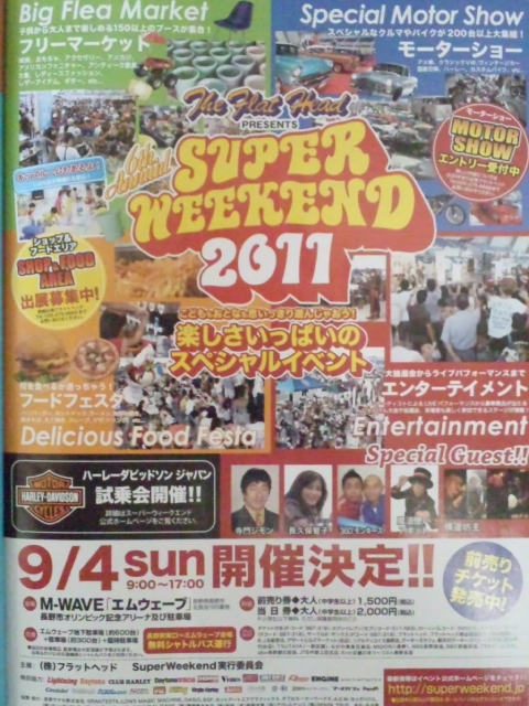 今年は震災の為 自粛で残念ながら開催は1日だけとなりました しかし2日開催してたイベントが1日になったのは・・・より濃いイベントになる事まちがいなし 毎年泊まりで遊びに行ってましたが 今年は日帰りツアーを実行します (詳しくは前回のsuper weekend2010の事は所さん的遊び部にあるので観て下さい) super weekendとは 今年で6回目となる アメ車・旧車・customカー・バイクと雑貨や服・グルメ等のアメリカンな祭りです 長野にある 洋服ブランドThe Flat Headがpresentするイベントで特別協力で雑誌 LightingやDaytona等が開催しま