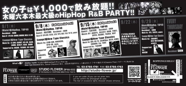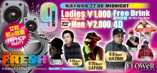 9月1日(木)六本木Studio FLOWERにて《 FRESH 》が開催されます。 毎週400人以上の来客数! 女性に大人気のHIP HOP PARTYとして六本木でも話題となり多いに盛り上がり中! 何といっても女性は飲み放題! 六本木のパーティーピープルは絶対必見です!!! 何処のパーティーよりもお得で楽しみる内容のパーティーです、是非遊びにいらしてください★ ☆☆☆☆☆☆☆☆☆☆☆☆ エントランスにて 『マリオ』のguestで, 『ミクシー』 とお伝え頂ければ何名様でも下記のGUEST料金で入場できます。 ☆☆☆☆☆☆☆☆☆☆