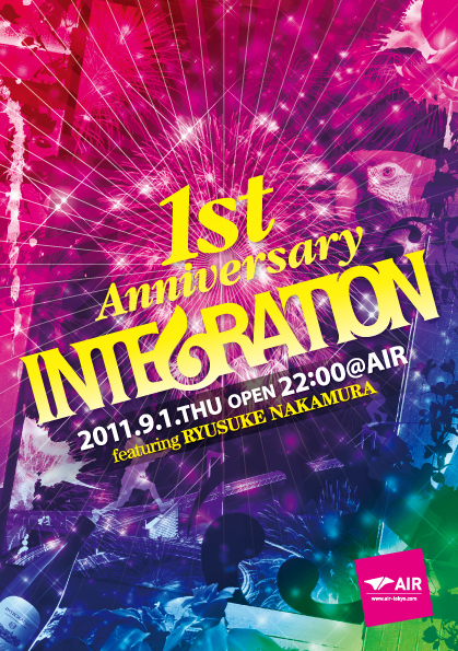 管理人様、告知スペース失礼します。 AIRの平日枠の中にあって、毎回コアな国内の実力派ゲストDJ&アーティストをフィーチュアし、奇数月第一木曜に開催している「INTEGRATION」のお知らせです★ 去年10月にOPENしたこのPARTYも、早いもので1周年を迎えますメインフロアでは、初回のRYUSUKE NKAMURAに始まり、DJ JURI、Satoshi Otsuki、Satoshi Fumi、HIROSHI WATANABE aka KAITOと、開催都度にHOUSEとTECHNOをクロスオーバーする、コアな実力派DJをフィーチュアしつつ、ラウンジではSAX+KEYBORDのライヴやライヴペインティング