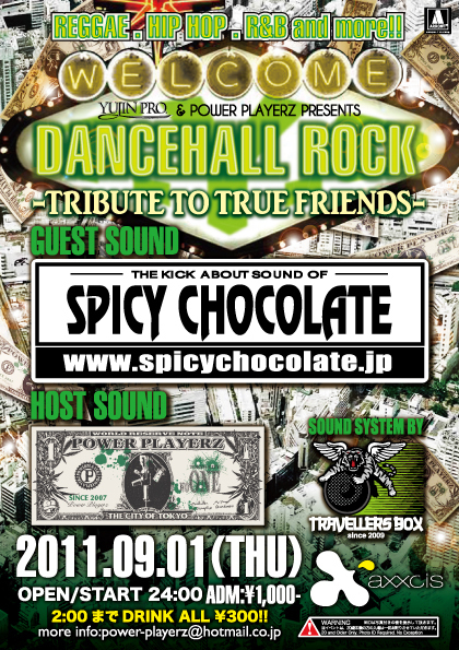 9/1(Thu) ★Every 1st Thursday★ YUJIN PRO.&POWER PLAYERZ PRESENTS DANCEHALL ROCK TYO -TRIBUTE TO TRUE FRIENDS- @AXXCIS -GENRE- REGGAE HIPHOP R&B and more!! -OPEN- 0:00 -ENTRANCE- ¥1000 2:00までDRINK ALL¥300!! -GUEST SOUND- SPICY CHOCOLATE -HOST SOUND- POWER PLAYERZ -SOUND SYSTEM BY- TRAVELLERS BOX ☆life is a gamble! 温故知新!何が起こるかわからない、東京で一番ドキドキできるparty。 月の始めの「DANCEHALL ROCK」に来れば、東京の全てがわかるはず。 逃す手だてはありませ