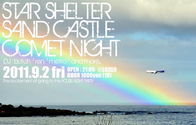 STAR SHELTER + SAND CASTLE + COMET NIGHT 2k11.9.2 @LUZ69 OPEN 21:00- DOOR 1000yen(1D) DJ : butch / ren / metro / ....and more ☆LUZ69 HOUSE ELECTRO 4っ打ちPARTYの豪華トリプルネームPARTYです♪ 皆さんお待ちしております!