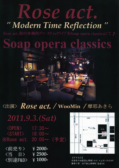 今年の春に行われたAtlantiQsのライブで、その時の主催者さんが僕らのバンドのライブを観て気に入って声を掛けてくれた・・というのがきっかけとなった今回のアコースティックライブですが、その主催者さんとSoap opera classicsさんとの話の流れでなんと今回は『トリ』でと言う事を聞かされ、ちゃんとしたアコースティックのライブは初舞台でいつもと違うstyle故に、若干の