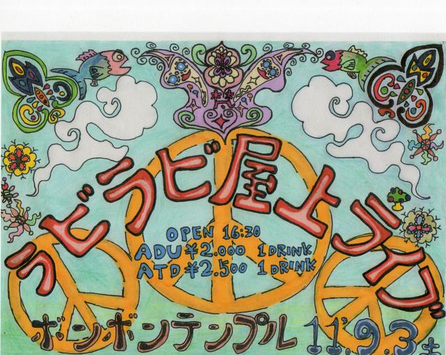 場所:梵梵寺(ルーフトップ) web:http://blog.livedoor.jp/bonbontemple/ 時:2011年9月3日 土曜日 開場:午後4時30分頃 開演:だいたい午後5時30分 お問い合わせ:梵梵寺 090−4169−7524 入場料 前売り2000円 当日2500円(ワンドリンクつき)お子様無料 40名様限定 ボクにメッセージor ボンボンテンプルでの前売り、もしくはお電話でご予約ください。