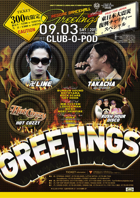 "UNITY SQUAD & LABALABA STUDIO PRESENTS." ☆GREETINGS Vol.3☆ -東日本大震災復興チャリティースペシャル- *DATE : 2011/9/3(SAT) *AT : CLUB O POD 青森県弘前市百石町2-1 かだれ横町2F *OPEN/START : 22:00〜 *TICKET(300枚限定) 前売り : \2500 w/1DRINK 当日 : \3000 w/1DRINK *SPECIAL GUEST 卍LINE HOT COZZY(AMATO RECORDS) TAKACHA aka STUDIO 8 *GUEST SOUND RUSH HOUR DISCO from 秋田 *HOST SOUND BUNBUN SOUND MOTOYAMA ROCK SCARE SKY HOOK *DANCE SHOW CASE A