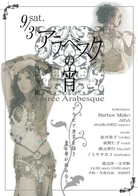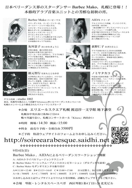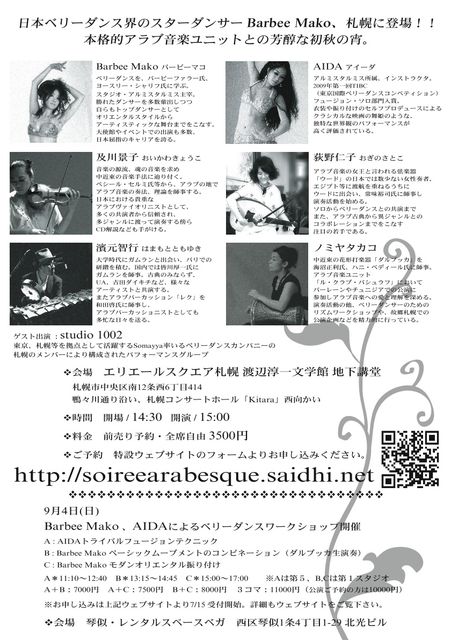 数多くのショーを企画、出演し、 主宰するスタジオアルミスタルミスからは、 ZIZI、Somayya、Suranなど、多くのスターダンサーを輩出している、 日本のトップダンサーのひとり、Barbee Makoが、札幌に登場します! 伝統的オリエンタルスタイルを大切にしながらも 常に新しいアイディアで、アーティスティックかつ、ショーアップされた 華やかなステージを創り続けるBarrbee Makoが、 スタジオ所属人気ダンサーAIDAとともに 札幌ではなかなか聴くことができない、 本格的アラブ音楽カルテットと共演します。 また、Somayya率いる