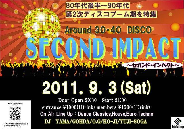 管理人様 告知失礼致します! 80's,90's00'sDISCO 『Second Impact』 1980年代後半から90年代の第2次ディスコブームを再現 かつての大箱DISCO DJがお送りする ジュリアナ世代の皆様必見の激盛イベントですよ 定番の80's90'sユーロ&ジュリテクから ダンクラ、HOUSEまで幅広くON AIR ■Door Open 20:30■ ■Start 21:00■ ◆料金◆ ntrance¥1500(1ドリ付) members¥1000(1ドリ付)Or FreeDrink Line Up YAMA GOHDA KO-JI Yuij-S O☆G 南7西5 LC拾番館 5