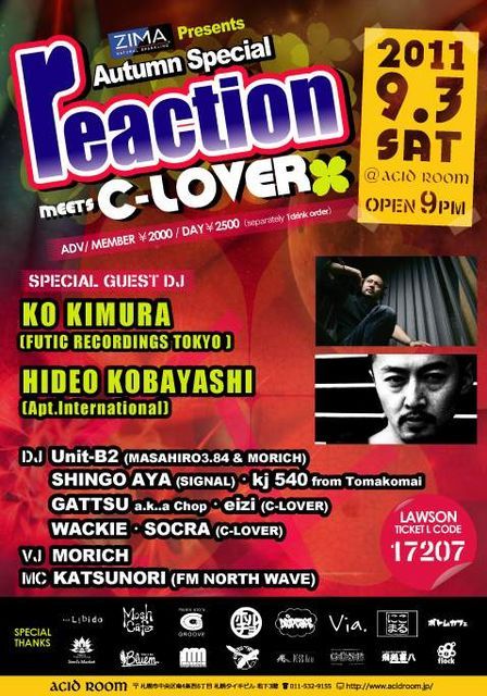 2011.09.03(SAT) ― ZIMA Presents reaction Autumn Special reaction meets C-LOVER この日はヤバい事になりそうです。。。 reactionとC-LOVERがガッチリタッグを組みます! しかもGUESTには日本のクラブ黎明期から第一線で活躍、 昨年でDJ25周年を迎えたDJ界のレジェンド KO KIMURA! さらに! 2006年サンフランシスコからの帰還後、 国内でもDJ、プロデューサー、リミキサーとしてトップの座を手中に納め、 世界の一線で戦える才能を備えたHIDEO KOBAYASHIもGUEST IN! 二大GU