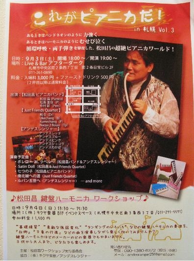 【これがピアニカだ!in札幌の詳細決定】 「♪あるときはバンドネオンのように力強く!」 「♪あるときはハーモニカのようにむせび泣く!」 「♪循環呼吸・両手弾きを駆使した、松田昌の超絶ピアニカワールド!」 ●日時:9月3日(土)開場18:00〜/開演19:00〜 ●場所:Live & Barアフターダーク 札幌市中央区南3条西7丁目 南2条日宝ビル2F 011―261―0890 ●料金:入場料\3.000+ファーストドリンク\500(2杯目以降は通常料金) ●出演:松田昌ピアニカバンド Just Friend Quartet アンデスレ