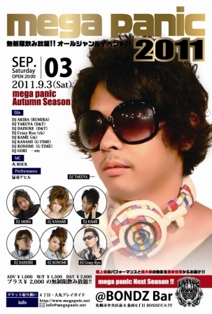 管理人様、告知失礼いたします。 【mega panic 2011】 「クラヴァーが熱狂する1年を締めくくるフィナーレシーズン[秋]の幕開け !!」 mega panic Autumn Season !! -Next Season !!- 札幌21世紀初の 無制限飲み放題!! 週末オールジャンル!! オンリーワン !! レギュラーイベント!! スタッフ一同、総力を挙げて「すすきの最新空間@BONDZ Bar」にて開催 !! ■日時 (Date) 2011年9月3日(土) OPEN 20:00/START 20:30 ■料金 (Fee) check !! 料金が更にお得になりました !! Price Down !! 史上最