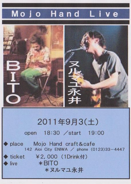 Mojo Hand LIVE! 今回は、骨のある男達のLIVEです! 横浜から(旭川出身)、浜の唄い人BITOさんと、 札幌の鬼才!吼える男ヌルマユ永井さんが、 Mojo Handでまたまた吼えてくれます! ぜひとも、皆さまいらっしゃって下さい! マメ情報といたしまして、 ヌルマユ永井さん在籍バンド「ヌルマユ」のプロモーションビデオが、 先日、JR恵庭駅にて無事撮影されました。 完成しましたあかつきには、テレビの音楽番組などでプロモーションビデオが 流れるそうです。 恵庭駅がどのように撮影されているのか楽しみで