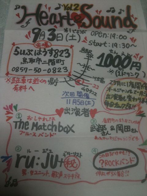 らいぶはうす823 & ようこ企画 Heart&Sound第二弾 9月?日土曜日 19時30分〜21時30分 チケット1000円drink 別注文 ♪♪♪出演者♪♪♪ ・The Matchbox ブルースバンド ・ru:Ju+秘密のギターリスト ・武部さん&岡田さん ・Gotch