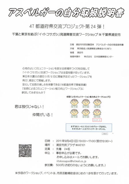 【震災・災害についての注意点】 http://iitoko-sagashi.blogspot.com/2011/04/blog-post_1521.html 申し込み前に読んでおいて下さい(申し込み方法がわからない方もお読み下さい) http://iitoko-sagashi.blogspot.com/2011/04/blog-post_6856.html ※ ディスレクシアの皆様はこちらをお読み下さい。 http://iitoko-sagashi.blogspot.com/2010/08/blog-post.html 発達障害当事者(アスペルガー、ADHD、高機能広汎性等自閉症スペクトラム)にとって、心地のよくコミュニケーションを試せる「居場所」となることを夢見て立ち上げました…