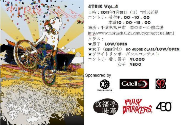 4TRiK Vol.4 日時:2011年 7月 31日(日)*雨天延期 エントリー受付9:00〜10:00 本番10:00〜18:00 場所:千葉県松戸市 森のホール前広場 クラス: ★男子 LOW/OPEN ★女子(kids含む) no judge/LOW/OPEN ★グライドリンボーダンスコンテスト エントリー費: 男子 \1,000 女子 \500 場所↓ http://www.morinohall21.com/event/access1.html ☆当日はスクールもやるので初心者の子もフルってご参加あれ!みんなで楽しく乗りましょ♪