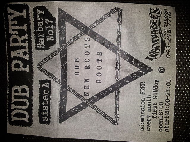 2011/9/4 DUB PARTY 毎月第一日曜日開催 千葉のDUB好きの方お待たせしましいた。 千葉で唯一のDUBのレギュラーパーティーです。 入場料は無料なのでお時間のある方は是非お立ち寄りください Jah Shakaやリー・ぺりーやエイドリアン・シャーウッドが好きには嬉しい選曲になってますよ。 reggae好きの方以外もおと好きの方は結構はまると思います。 音響のセッティングにも力をいれています。 会場デコレーションもあるかも!? Sister A Barbary no17 FB