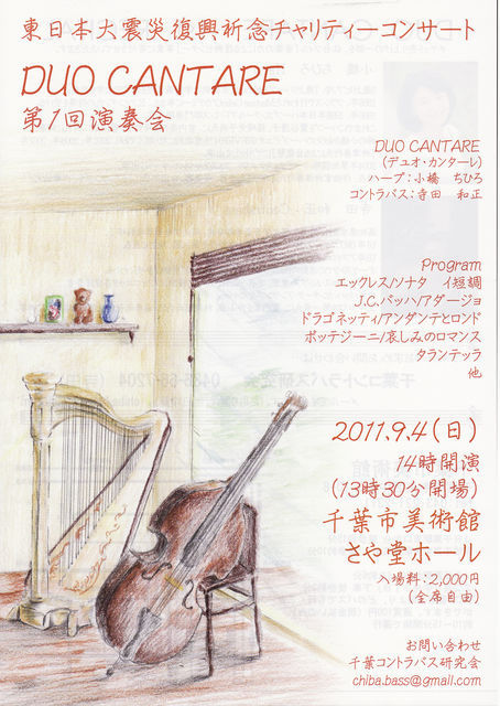 スペースお借りいたします。 このたび、下記のコンサートを開催いたします。 収益金は被災地に音楽を届けるための基金に寄付いたします。 音楽の力で、人々の心に復興のエネルギーを! 東日本大震災復興祈念チャリティーコンサート DUO CANTARE 第1回演奏会 2011/9/4(日)14時開演(13時30分開場) 千葉市美術館 さや堂ホール 入場料:2,000円(全席自由) DUO CANTARE(デュオ・カンターレ) ハープ:小橋 ちひろ コントラバス:寺田 和正 プログラム エックレス/ソナタ イ短調 J.C.バッ