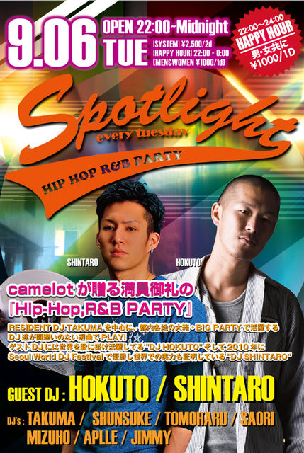 告知失礼致します。 9月6日(火)22:00〜渋谷キャメロットにて http://www.clubcamelot.jp/ 毎週火曜日開催の♪Hip-Hop,R&B PARTY♪ 『SPOTLIGHT』 往年のHIT曲からビルボードヒットまで幅広くPLAY♪ DJオンリーの踊れるPARTY♪ RESIDENT DJ TAKUMAを中心に、都内各地大箱・BIG PARTYで活躍するDJ達が間違いの無い選曲でPLAY! ゲストDJには世界を股に掛け活躍してる''DJ HOKUTO''そして2010年SEOUL WORLD DJ FESTIVALで優勝し世界での実力も照明している''DJ SHINTARO'' お馴染みのレギュラーDJ陣は 『camelotレ