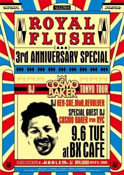 管理人様、告知失礼します。 今夜9/6(火)に渋谷ハーレム+BX CAFEにてレジデントDJ KANGO & KOYAで毎週火曜開催の「RED ZONE」が開催されます 入り口で「DJアツシのゲストでハーレム」と伝えてもらえれば何名でも終日¥1500/1Dのゲスト入場できるので気軽にご利用ください またメッセージや書き込みでの連絡でもゲスト取ります。 今夜のBX CAFEは〈ROYAL FLUSH 3RD ANNIV. SPECIAL〉! 前回ハリケーンの影響で来日が中止となった DJ COSMO BAKER from NYC の来日が早くも大決定! イベント詳細です 「R