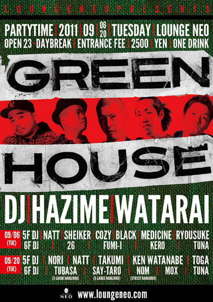 ¡ùËÜÆü͹ë²Ú¥²¥¹¥ÈDJHAZIME&DJWATARAI½Ð±é¡ù¡÷Lounge Neo¤ªÆÀ¤Ê¥²¥¹¥È°ÆÆâ¤Ï¥³¥Á¥é¡ù -------------------------------------------------------------------------------------------------------------------------------- 9/6(TUE) Green House@Lounge NEO DJ HAZIME & WATARAI½Ð±é¤ÎLounge NEO´ÇÈÄ¥¤¥Ù¥ó¥È¡ÖGreen House¡× ÆüËܤòÂåɽ¤¹¤ë¤³¤Î2DJ¡Çs¤òɮƬ¤Ë¥Ï¥¤¥¯¥ª¥ê¥Æ¥£¡¼¤ÊÁª¶Ê¤Ç¥Õ¥í¥¢¤òÇúȯ¤µ¤»¤Þ¤¹!! DJ¿Ø¤âÅÔÆâ¤Ç³èÌö¤¹¤ë¥á¥ó¥Ä¤ò½¸¤áÇ»¤¤ÆâÍÆ¤ÇÁ÷¤ë²ÐÍËÆü¤ÏNEO¤Î´ÇÈÄevent!! º£·î¤«¤éÂè1²ÐÍËÆü¤À¤±¤Ç¤Ï¤Ê¤¯Â裳²ÐÍˤâGREE